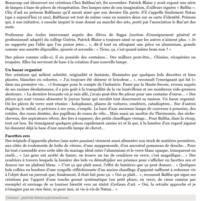 Dernièrement (effet Covid : manque de matière)… il recherche les lampes articulées d’atelier, au passé ouvrier, à valeur patrimoniale. Il tente de les magnifier tout en les préservant. Restauration mais aussi création toujours par assemblage d’embases (étaux par exemple) ou en en totalité toujours à partir d’éléments au design vintage.