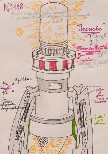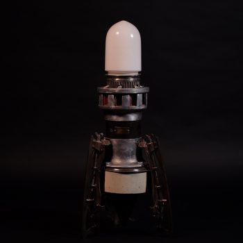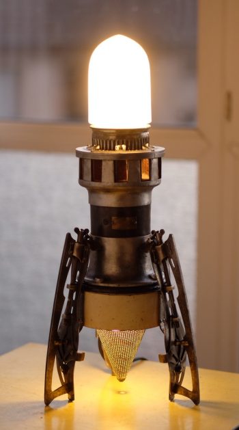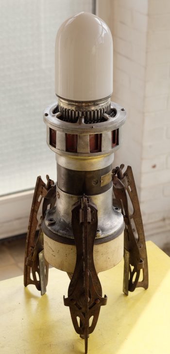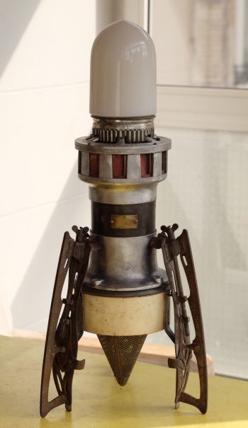 Fusée – sirène qui veillait par ses alarmes sur la population civile, ancrée au sol, très stable sur ces trois patins à glace … de par son allure de phare dans la nuit, elle illumine de sa bienveillance…hauteur : 50 cmEmbase au sol : 25 x 25 cm260 euros