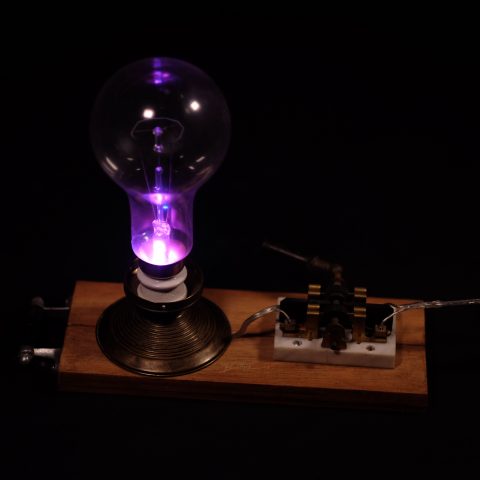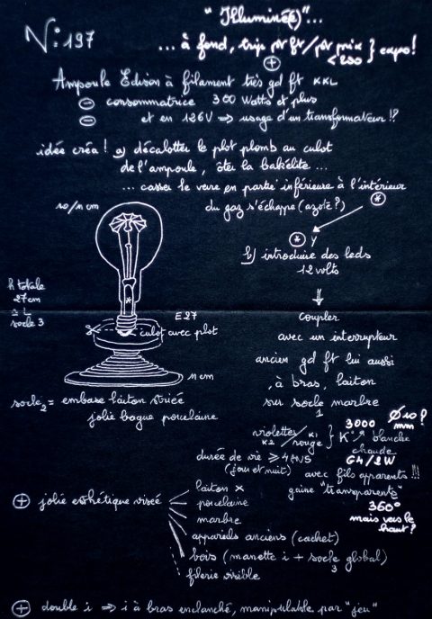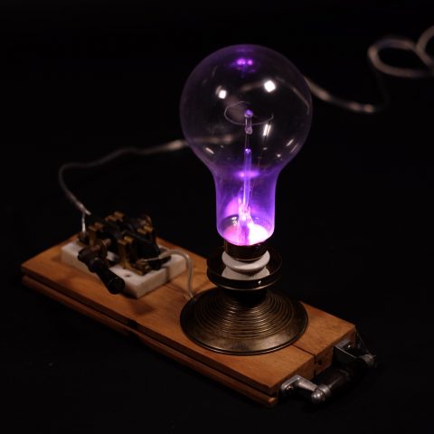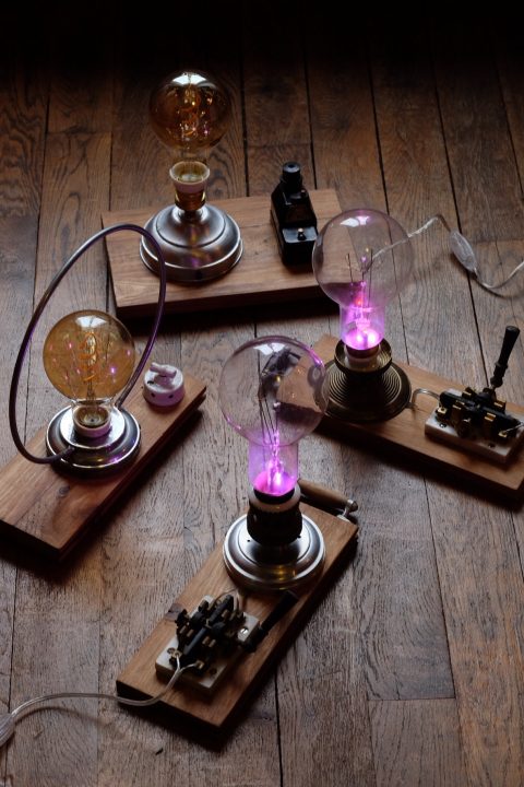 Décalottée pour la culotter différemment, avec apport de leds 12 volts mixés couleur violine, trônant sur son socle parquet chêne, elle est présentée avec un double interrupteur dont un très ancien sur embase marbre. Ceci permet une manipulation ludique et pédagogique en toute sécurité… Possibilité de la suspendre sur le plan vertical grâce à sa poignée alu/porcelaine.